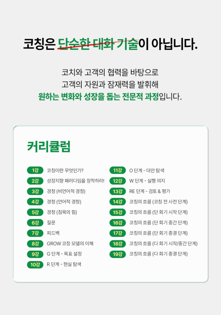 코칭을 처음 배우는 분도 쉽고 체계적으로 학습할 수 있도록 설계되었습니다.